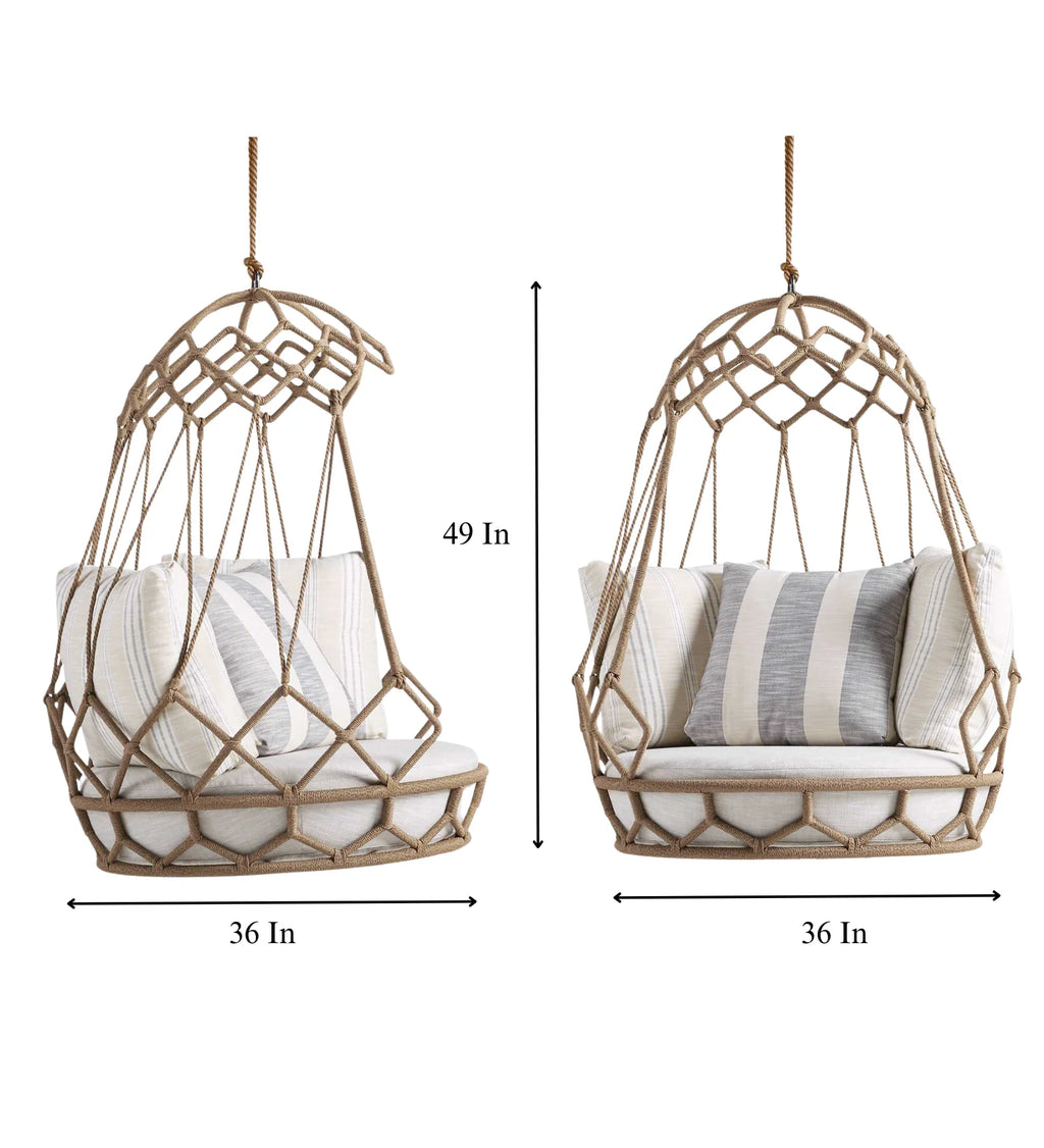 Experience serene comfort with our Indian-crafted Single Seater Rope Swing without Stand. Meticulously handwoven and featuring a powder-coated frame, it exudes durability and charm. The water-resistant, comfortable fabric enhances relaxation, making it an ideal addition to your outdoor oasis. Elevate your space with this artfully crafted swing, designed to withstand the elements while providing moments of pure bliss.
